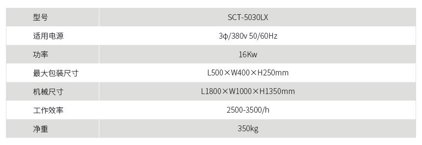 SCT-5030LX高速恒温收缩膜包装机采用下部运风,且风量由变频器任意调整输送由变频器控制,速度无级可调炉腔上部可以打开,便于清洁及维护,通过收缩包装机前面的视窗可看见包装的整个过程,可根据需要选配前端动力进料线及后端无动力贮物平台热风循环系统,可减少加热时间炉内热力循环不断,隔热纤维物料有效减少热量流失,生产车间温度不受影响大量节省电力,能源效率特高左右气流导向及底风流量可以调较基本配置滚轴输送带,可按产品要求配备不锈钢或铁氟龙。